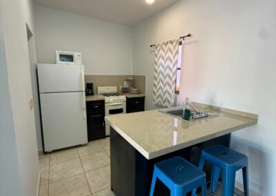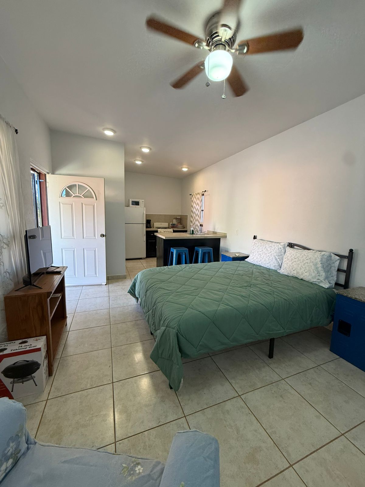 The studio is fully equipped with everything you need for a pleasant stay, including a comfortable king-size bed, TV, and air conditioning (mini-split). It also features a convenient dining bar. The kitchen comes with a gas stove, microwave, and all the essential utensils to easily prepare your meals. Additionally, there is a full bathroom for your comfort.